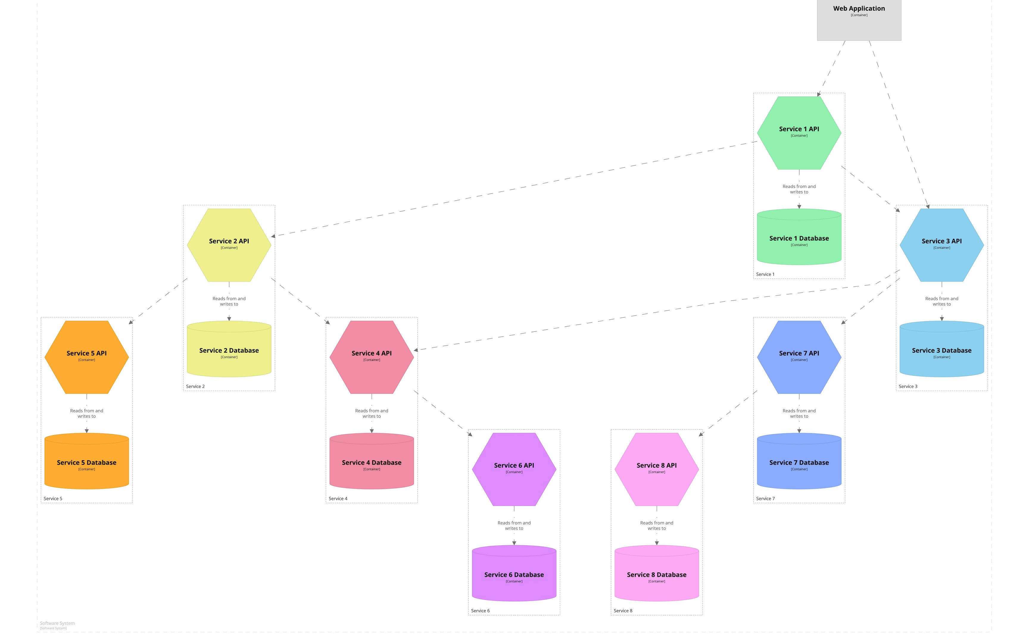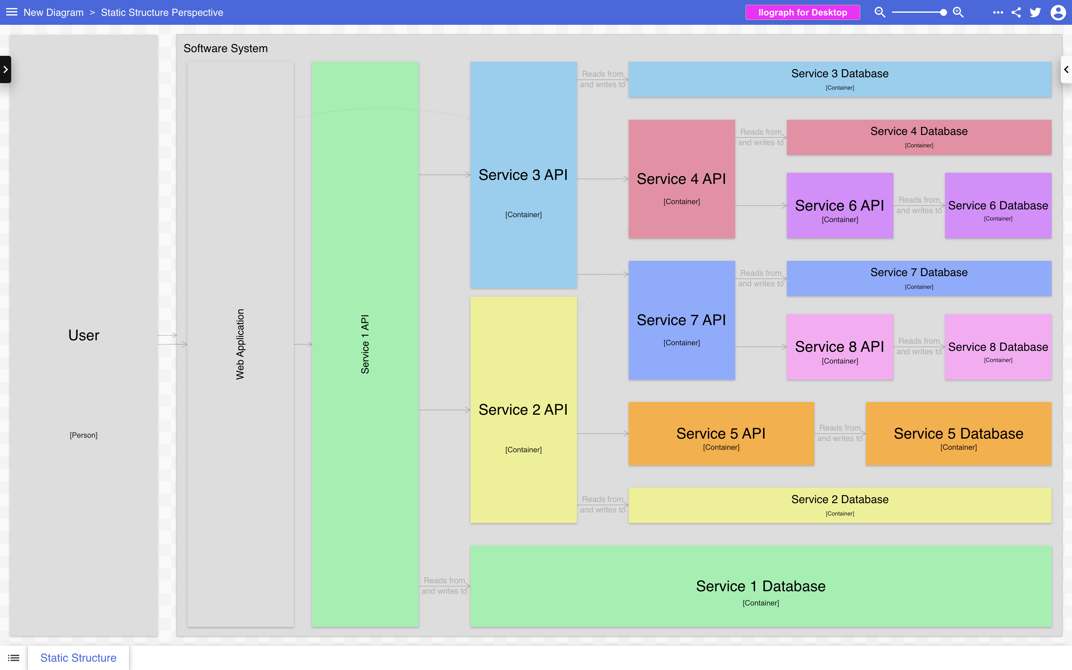 Затем вы можете использовать цвет и формы для дополнения диаграммы, либо для добавления дополнительной информации, либо для придания диаграмме более эстетичного вида. Хотя вы можете увидеть множество примеров диаграмм и инструментов, в которых используются синие и серые прямоугольники1, это не то, что диктуется моделью C4, и вы можете использовать какие угодно цвета, которые вам нравятся!